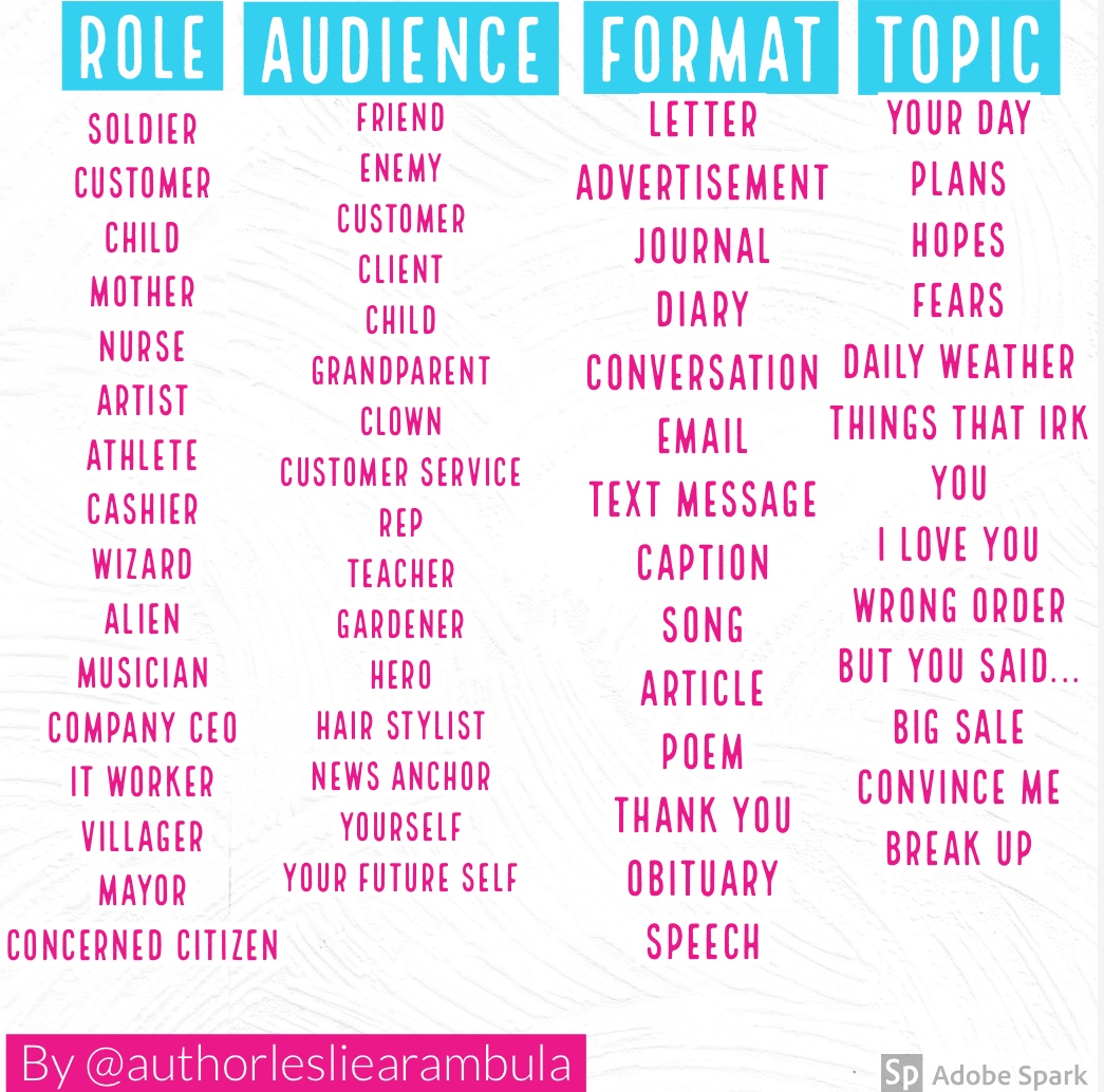 This is the what you are writing about. While this may seem super important, as part of this exercise, it is actually the least important component of RAFT writing. This is because the goal is to attempt to use perspectives and formats that we may not be comfortable with.